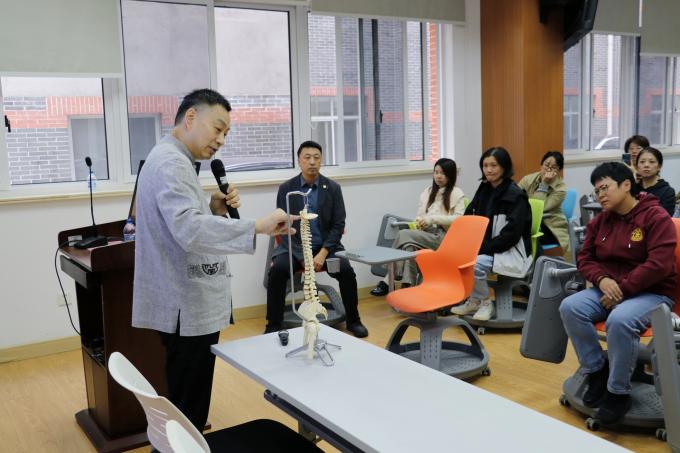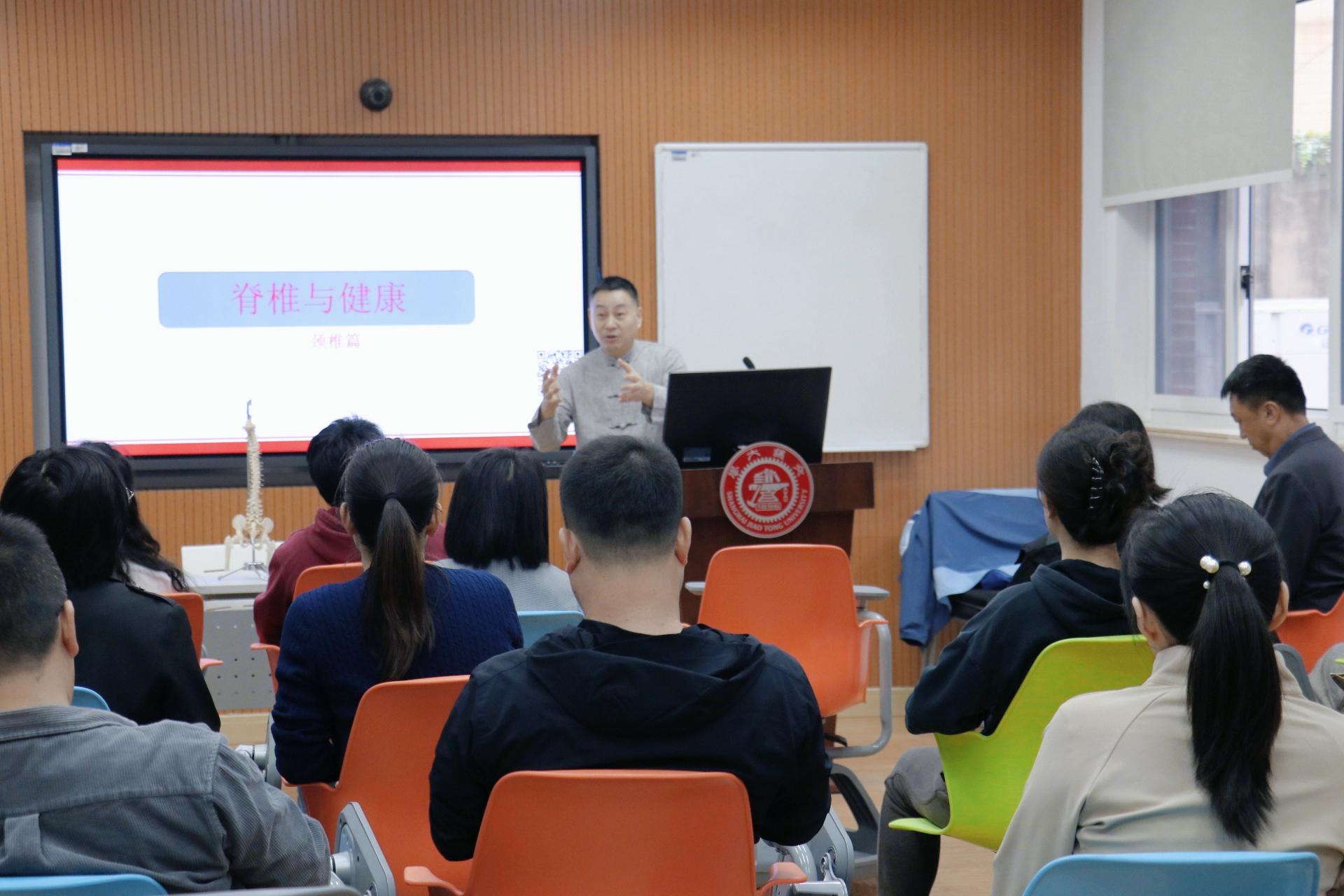 为切实关爱教职工身心健康,普及脊柱健康知识,提升自我保健能力,有效预防和缓解办公室人群常见的颈肩腰腿问题,上海交通大学终身教育学院工会于2025年10月21日中午在长宁校区南楼107教室,成功举办了“守护脊柱健康,乐享品质生活”脊椎保健专题讲座。讲座吸引了众多教职工踊跃参与,现场座无虚席。