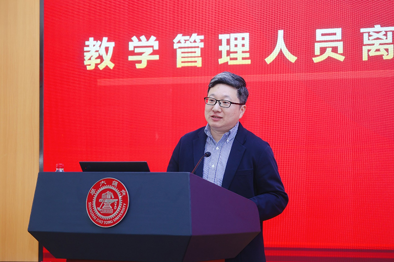 离岗不离心,始终守初心。过去的一年中,电子信息与电气工程学院原副院长韩韬、马克思主义学院原副院长周凯、生命科学技术学院原教务办主任谭晶、安泰经济与管理学院原教务办主任周道力、设计学院王婷五位老师转岗离开了教学管理队伍,本次活动中为他们举办了简洁而温馨的离岗欢送仪式。周凯作为代表上台分享了自己从事本科教学管理方面的工作经验和体会,并表达了自己的依依不舍和真诚感谢。