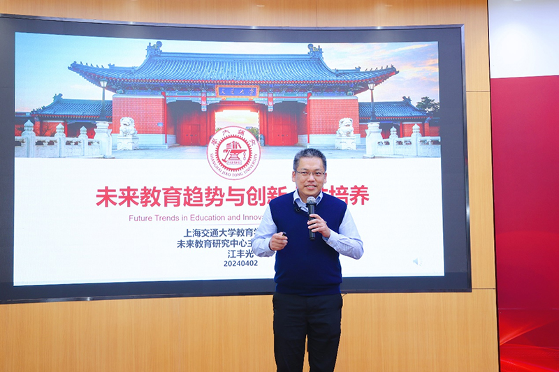 活动最后,教育学院副院长江丰光教授受邀做主题报告《未来教育趋势与创新人才培养》。他概述了当前的国际国内大背景,指出传统教育中存在的问题,继而展望了未来教育的发展趋势。他认为,在人工智能日益影响教育的今天,我们的教育系统需要积极拥抱变革,努力培养出具备前瞻性思维和解决问题能力的创新型人才。