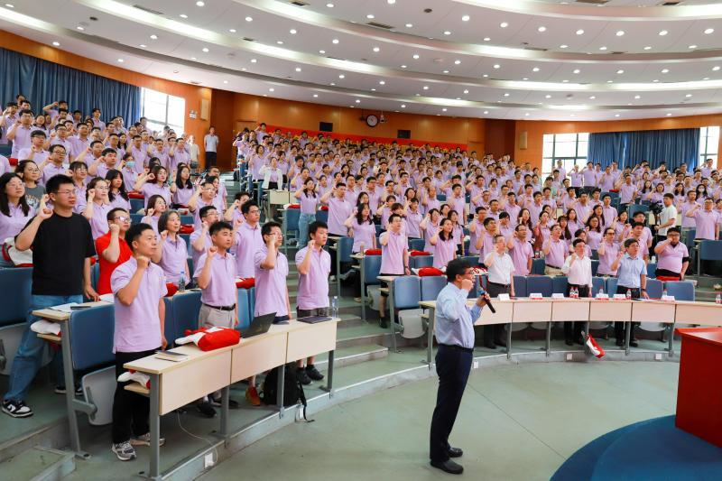 网络空间安全学院院长、讲席教授谷大武带领新进教职工宣誓,全体新入职教师举起右拳,用整齐洪亮的誓言表达了忠诚党的教育事业,履行立德树人、教书育人职责,引领学生健康成长,做有理想信念、有道德情操、有扎实学识、有仁爱之心的“四有”好老师的决心。
