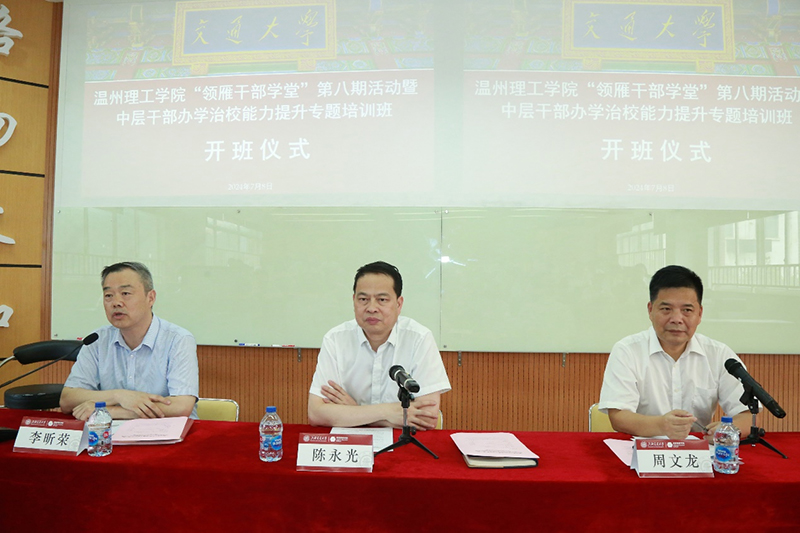 7月8日至12日,温州理工学院“领雁干部学堂”第八期活动暨中层干部办学治校能力提升专题培训班在上海交通大学长宁校区顺利举行。温州理工学院党委书记陈永光,温州理工学院校长、党委副书记周文龙,上海交通大学终身教育学院党委书记李昕荣出席开班仪式。温州理工学院校长、党委副书记周文龙,温州理工学院党委副书记吕朝晖,温州理工学院党委副书记王定福,温州理工学院党委委员、组织部部长金庆良,上海交通大学终身教育学院副院长项玉出席结业仪式。来自温州理工学院70余名中层干部参加培训。