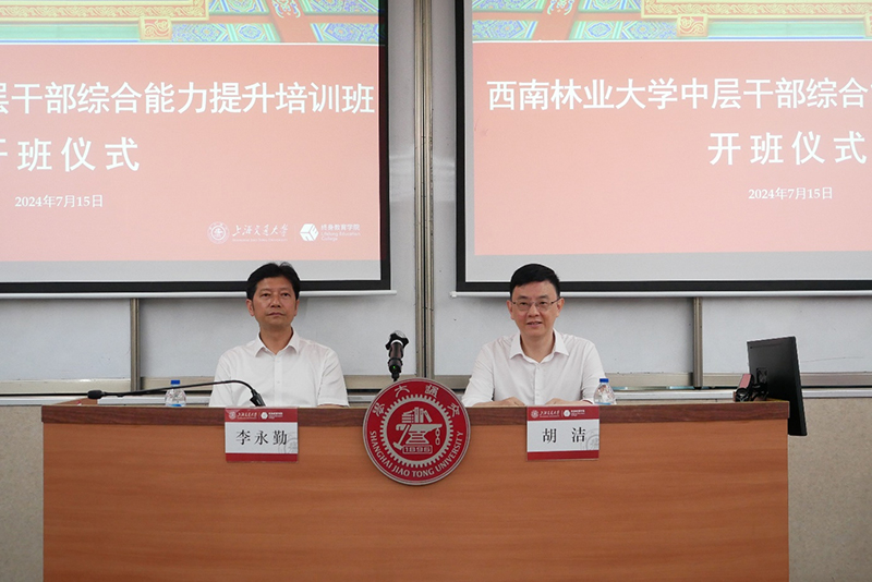 7月15日上午,由上海交通大学终身教育学院承办的“西南林业大学中层干部综合能力提升培训班”在上海交大长宁校区开班。西南林业大学党委书记李永勤、上海交通大学终身教育学院院长胡洁出席开班仪式。西南林业大学各学院、机关中层领导共计70人参加了此次培训,开班仪式由终身教育学院经济管理创新中心副主任田红梅主持。