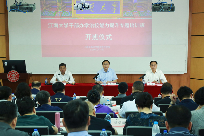 7月16日,江南大学干部办学治校能力提升专题培训班在上海交通大学长宁校区顺利开班。上海交通大学校务委员会专职副主任顾锋、江南大学党委书记吴正国出席开班仪式。仪式由江南大学校长、党委副书记、中国工程院院士陈卫主持。江南大学校党政领导班子及中层正职干部约80人参加此次培训。