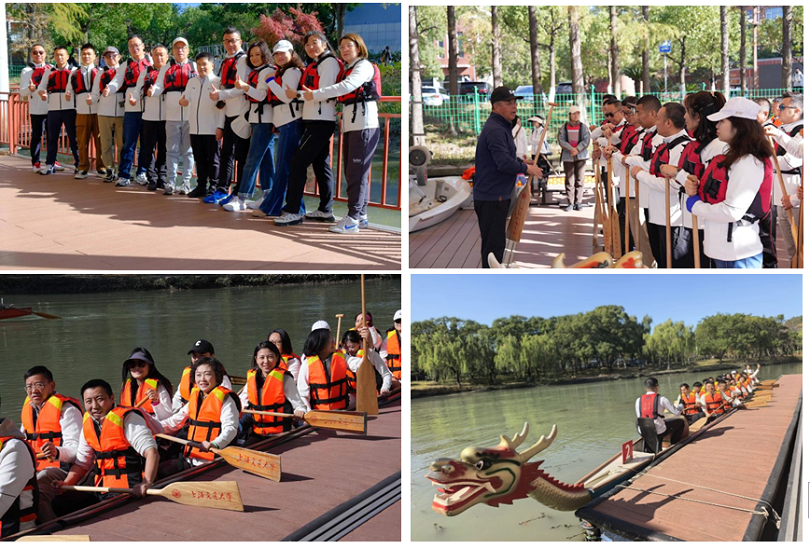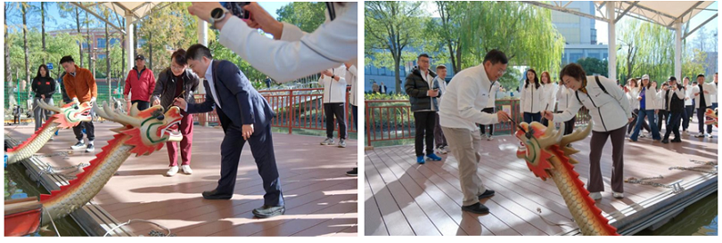 开幕式后的首项活动——龙舟竞渡体验赛在闵行校区龙舟码头精彩上演。周薇、蒋立峰以及学院原工会主席刘路喜、学院副院长吕忆松协对共同提笔,为即将出征的龙舟点睛。
