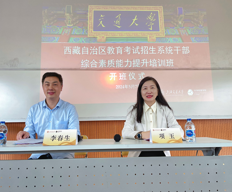 5月7日上午,由上海交通大学终身教育学院承办的西藏自治区教育考试招生系统干部综合素质能力提升培训班在上海交大长宁校区开班。西藏自治区教育考试院党总支组织委员、副院长李春生,上海交通大学终身教育学院副院长项玉出席开班典礼。来自西藏自治区招考人员60名教师参加此次培训。开班仪式由上海交通大学终身教育学院张瑞娇老师主持。