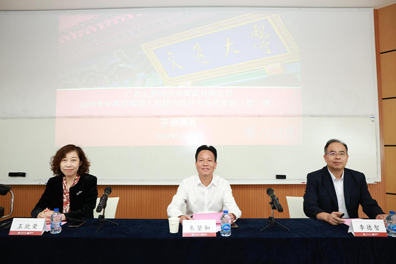 5月13日上午,广西北部湾投资集团有限公司中高层领导人员2024年能力提升专题研修班开班仪式在上海交通大学终身教育学院成功举办。广西北部湾投资集团有限公司党委书记、董事长朱坚和,广西北部湾投资集团有限公司党委副书记、职工董事李德智,上海交通大学终身教育学院副院长王欣荣及培训班的80名学员们出席了开班仪式。